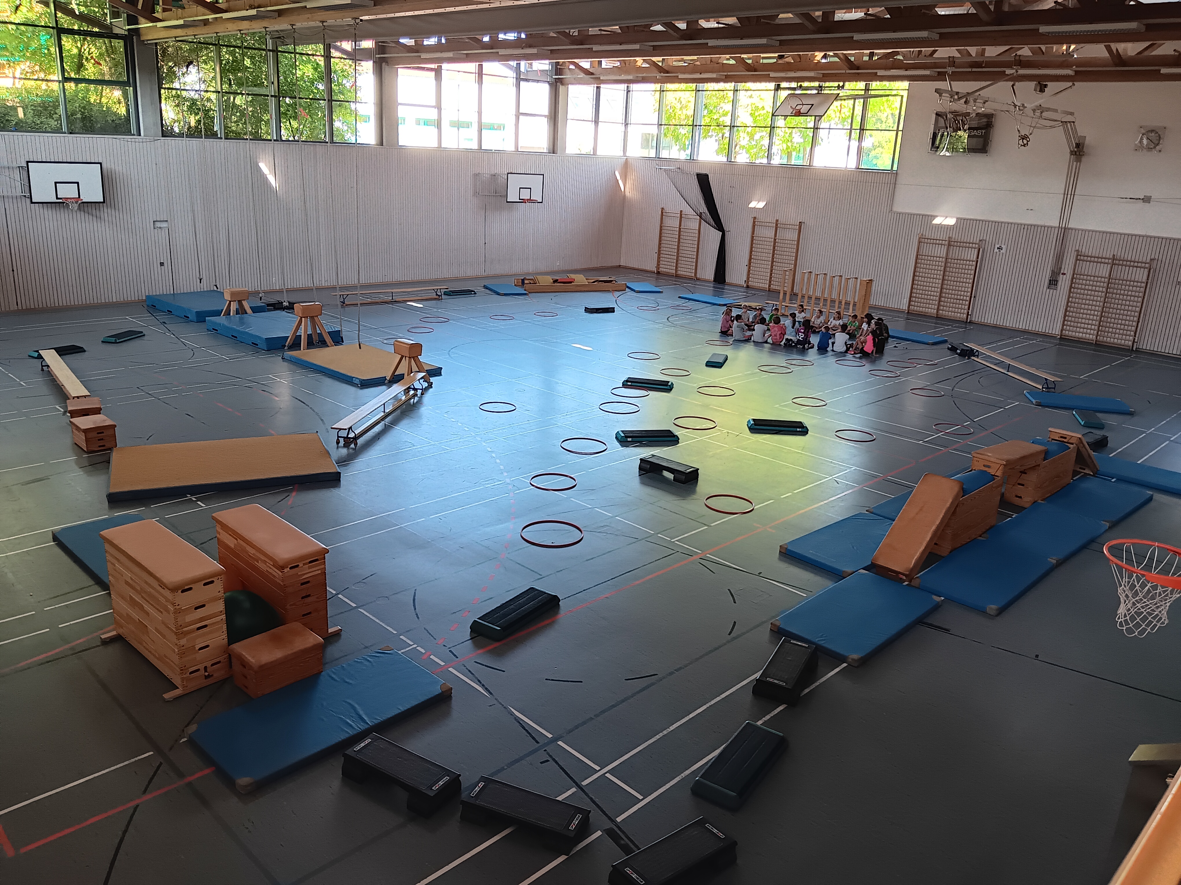 Am Ende gab es noch Ringfangen. Die Kinder auf dem Parkour wurden gefangen, nachdem der Fänger durch einige Ringe gesprungen ist.